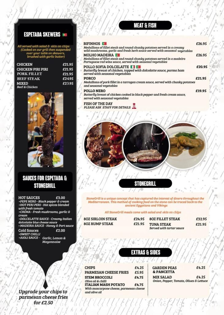 The choice of Italian sauce – in garlic, cream onion & white wine or Portuguese sauce – garlic, tomato, chilli & white wine
